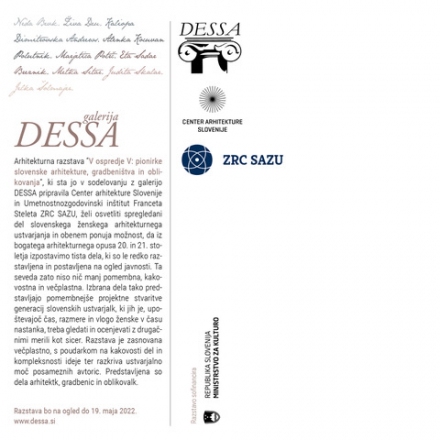 Arhitekturna razstava V ospredje V: pionirke slovenske arhitekture, gradbeništva in oblikovanja, ki sta jo v sodelovanju z galerijo DESSA pripravila Center arhitekture Slovenije in Umetnostnozgodovinski inštitut Franceta Steleta ZRC SAZU, želi osvetliti spregledani del slovenskega ženskega arhitekturnega ustvarjanja in obenem ponuja možnost, da iz bogatega arhitekturnega opusa 20. in 21. stoletja izpostavimo tista dela, ki so le redko razstavljena in postavljena na ogled javnosti. Ta seveda zato niso nič manj pomembna, kakovostna in večplastna. Izbrana dela tako predstavljajo pomembnejše projektne stvaritve generacij slovenskih ustvarjalk, ki jih je, upoštevajoč čas, razmere in vlogo ženske v času nastanka, treba gledati in ocenjevati z drugačnimi merili kot sicer. Razstava je zasnovana večplastno, s poudarkom na kakovosti del in kompleksnosti ideje ter razkriva ustvarjalno moč posameznih avtoric. Predstavljena so dela devetih arhitektk, gradbenic in oblikovalk: Neda Bevk, Živa Deu, Kaliopa Dimitrovska Andrews, Alenka Kocuvan Polutnik, Marjetica Potrč, Eta Sadar Breznik, Metka Sitar, Judita Skalar, Jelka Šolmajer.