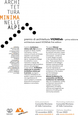 Comunità Montana di Valle Camonica, as part of the VIONElab project, establishes the international Minimal Architecture Award in the Alps (Premio Architettura minima nelle Alpi) to highlight and support quality architectural interventions, capable of producing a regeneration of existing volumes and triggering new dynamics of housing and community evolution in small mountain villages, through projects characterised by high quality obtained through a minimum use of volumes, energy and resources.