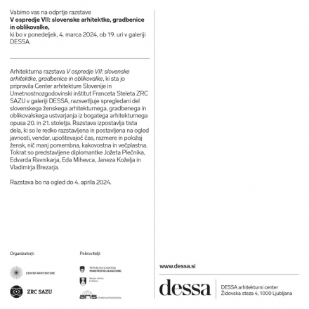 We kindly invite you to the opening of the exhibition To the fore VII: Slovenian female architects, builders and designers, which will be held on Monday, March 4, 2023, at 7 p. m., in the DESSA gallery.