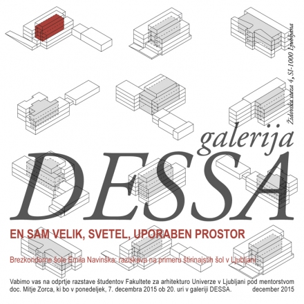 Vabimo vas na odprtje razstave 14ih ljubljanskih šol arhitekta Emila Navinška, ki jo je Dessa pripravila s študenti Fakultete za arhitekturo Univerze v Ljubljani pod mentorstvom doc. Mitje Zorca. Odprtje bo v ponedeljek, 7. decembra 2015 ob 20. uri v galeriji DESSA.